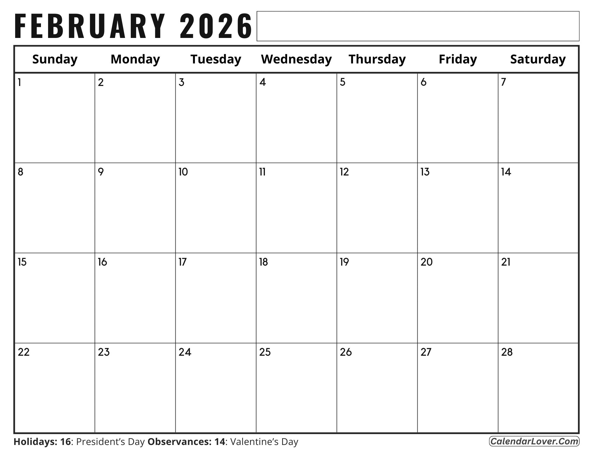 Calendar for February 2026 – United States