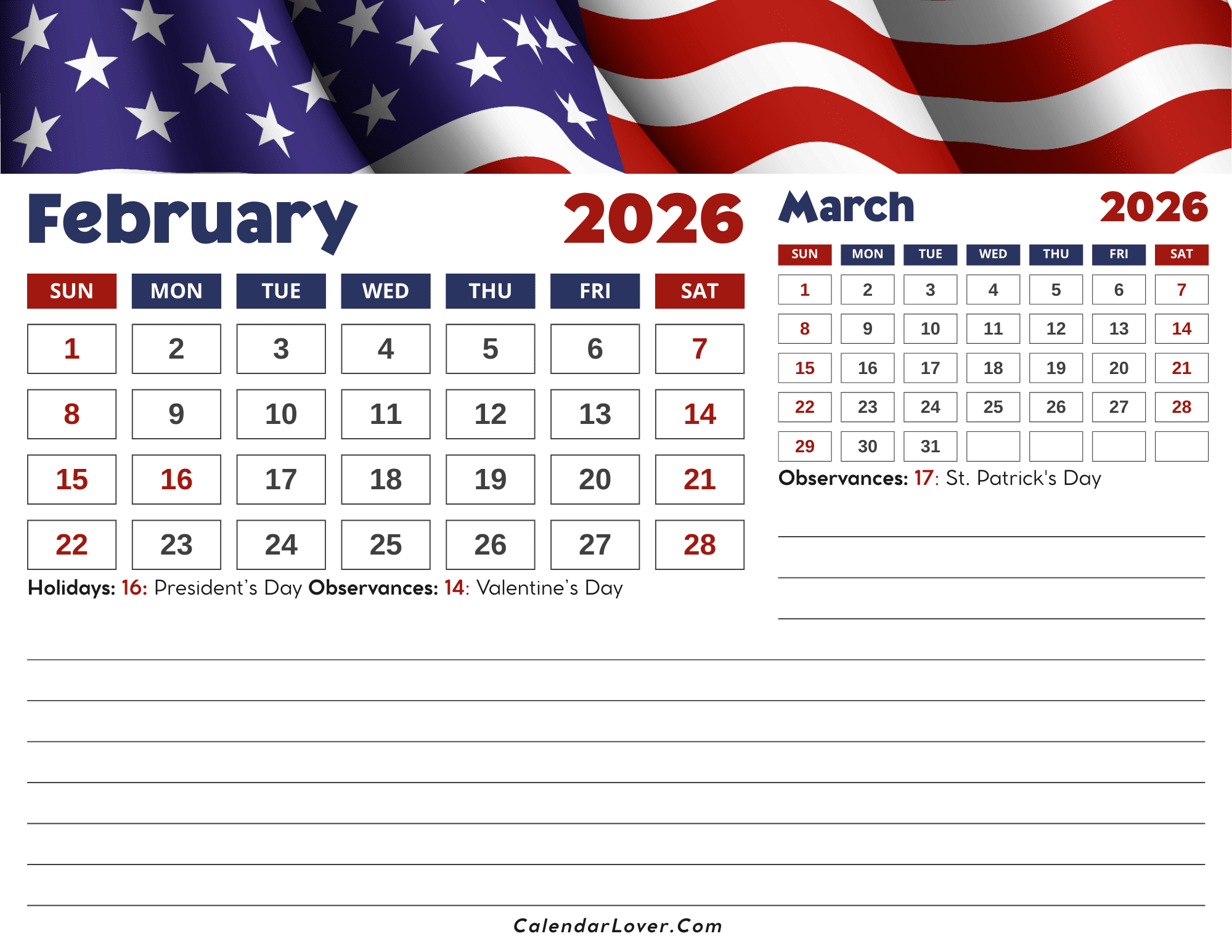 February 2026 Calendar with US Flag
