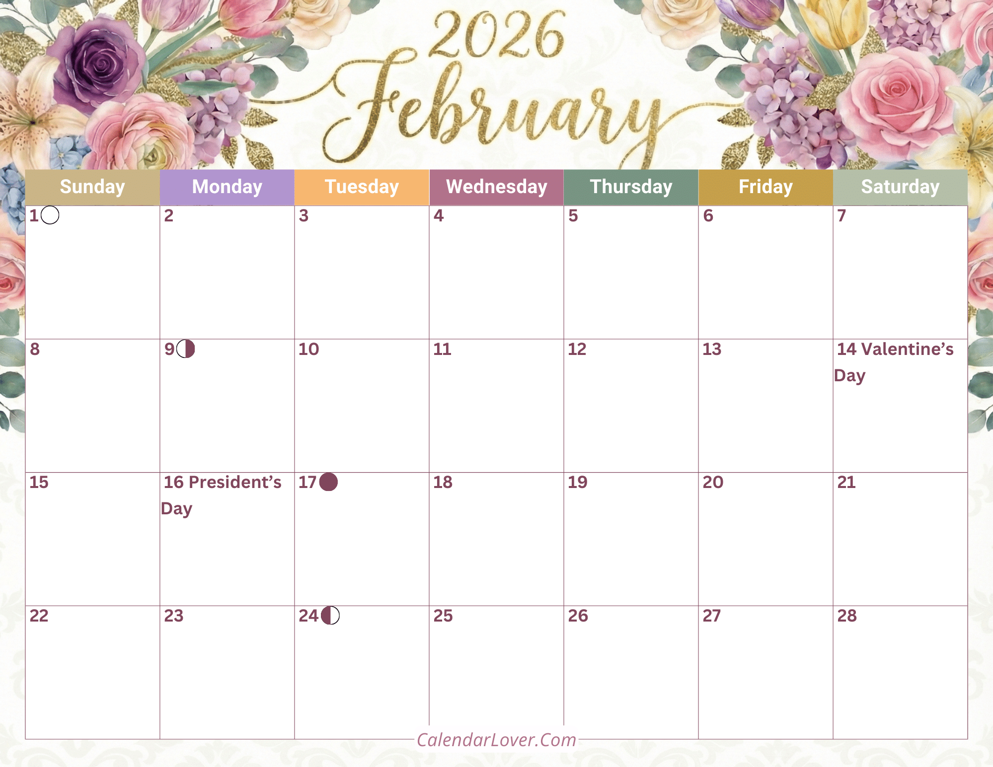 Floral February 2026 Calendar with Holidays