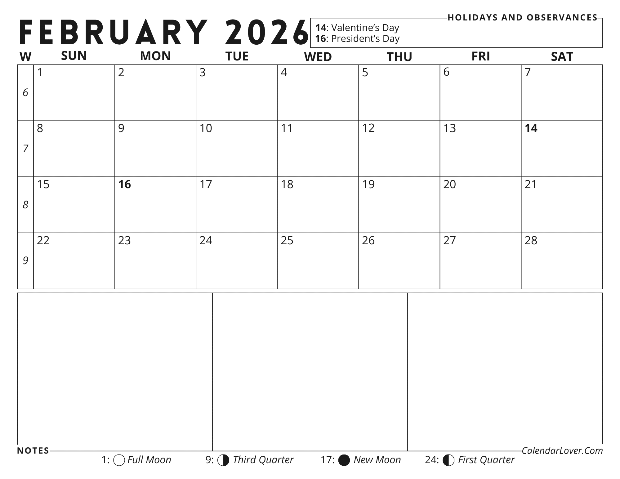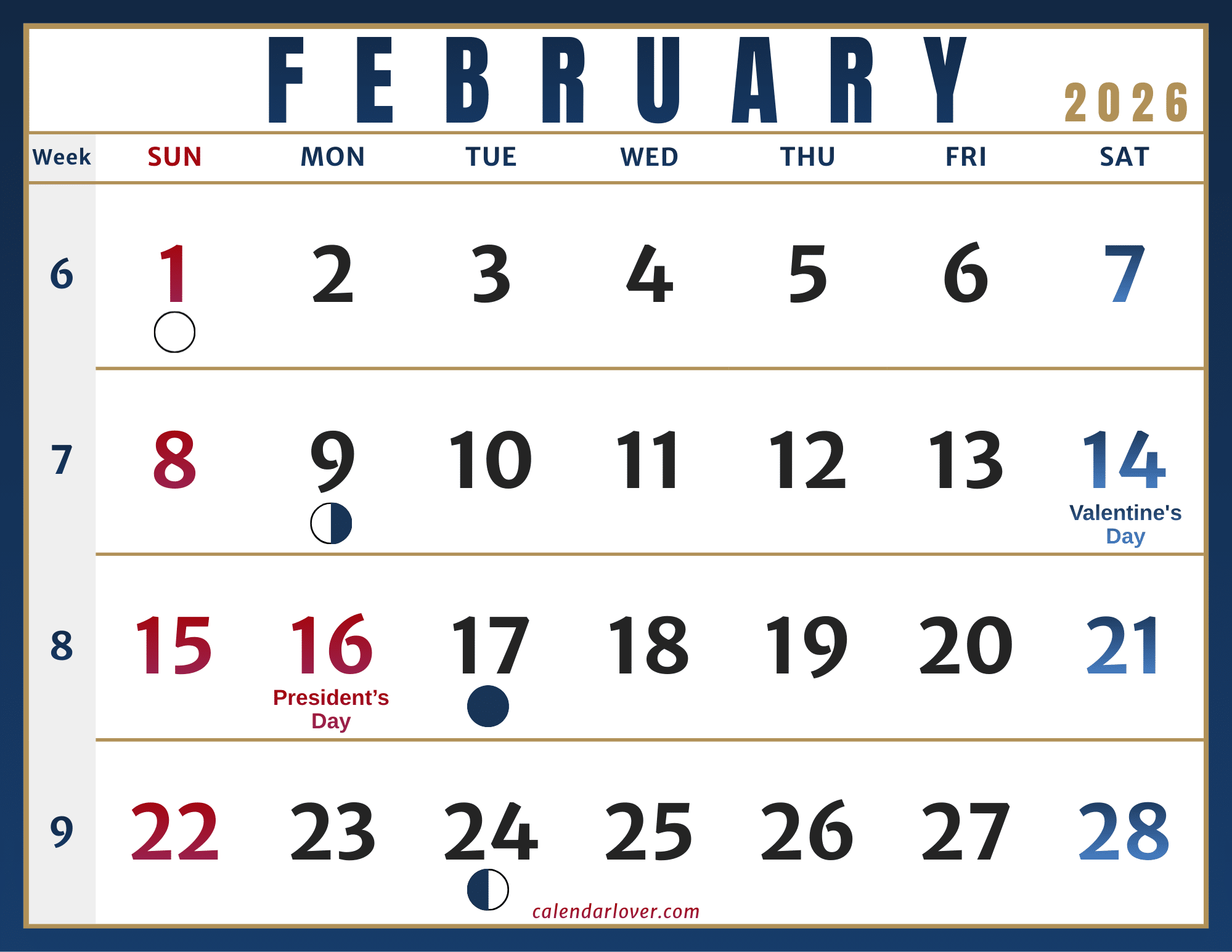 View the February 2026 calendar for the United States, including every federal and state holiday. Stay on top of your plans by noting key dates all month long, from major celebrations to religious and cultural observances. You can personalize the calendar and download printable templates by tweaking settings such as week numbers, main moon phases, and the day your week begins.